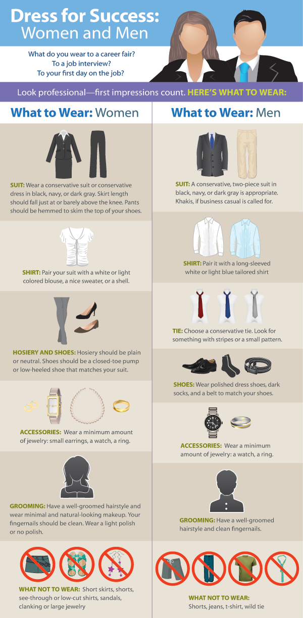 Information on how to dress for a professional interview with an employer, networking event, or function that requires business attire.